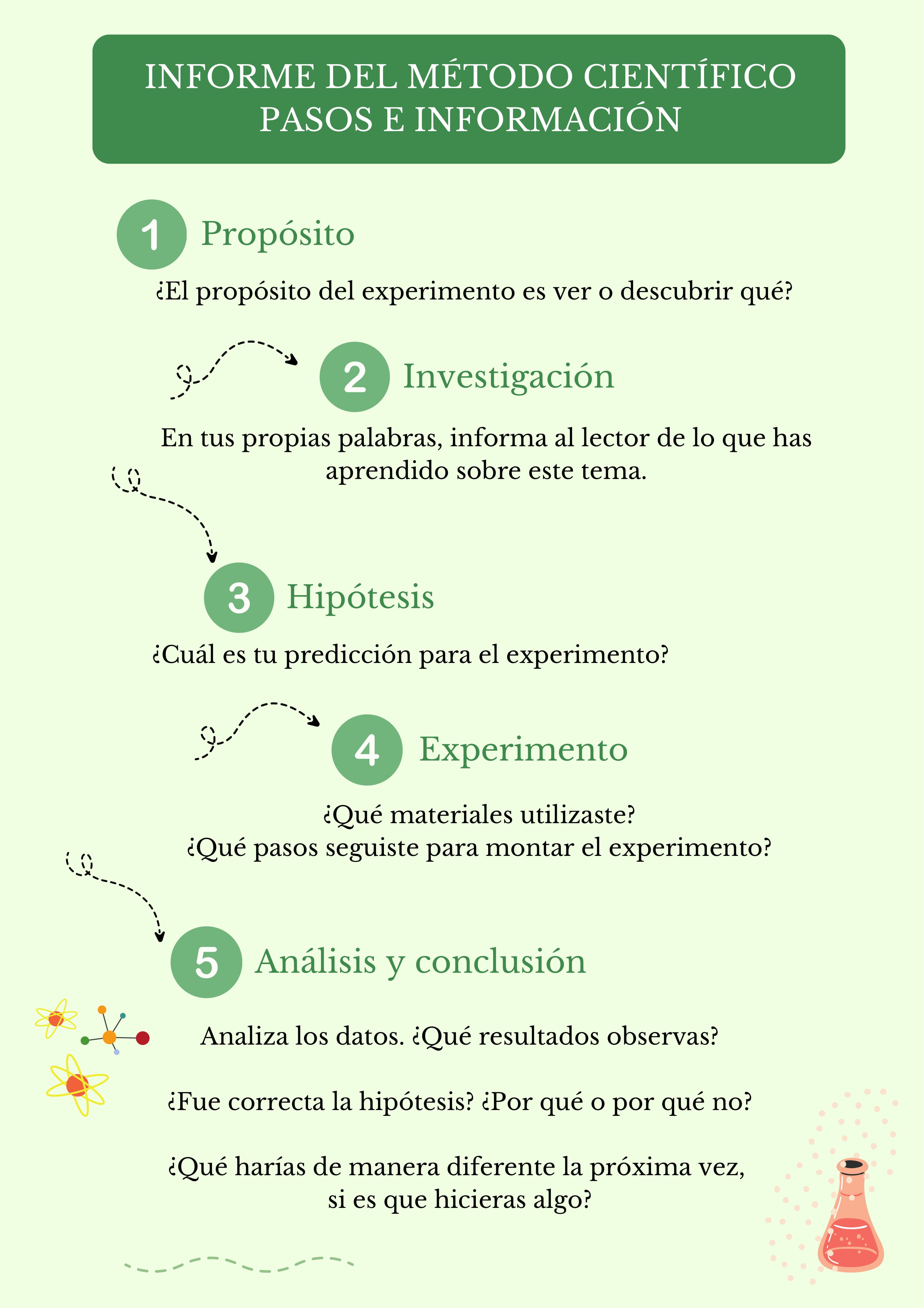 Una guía de 10 páginas que muestra de forma organizada los pasos del método científico, perfecta para acompañar a los niños en sus proyectos.