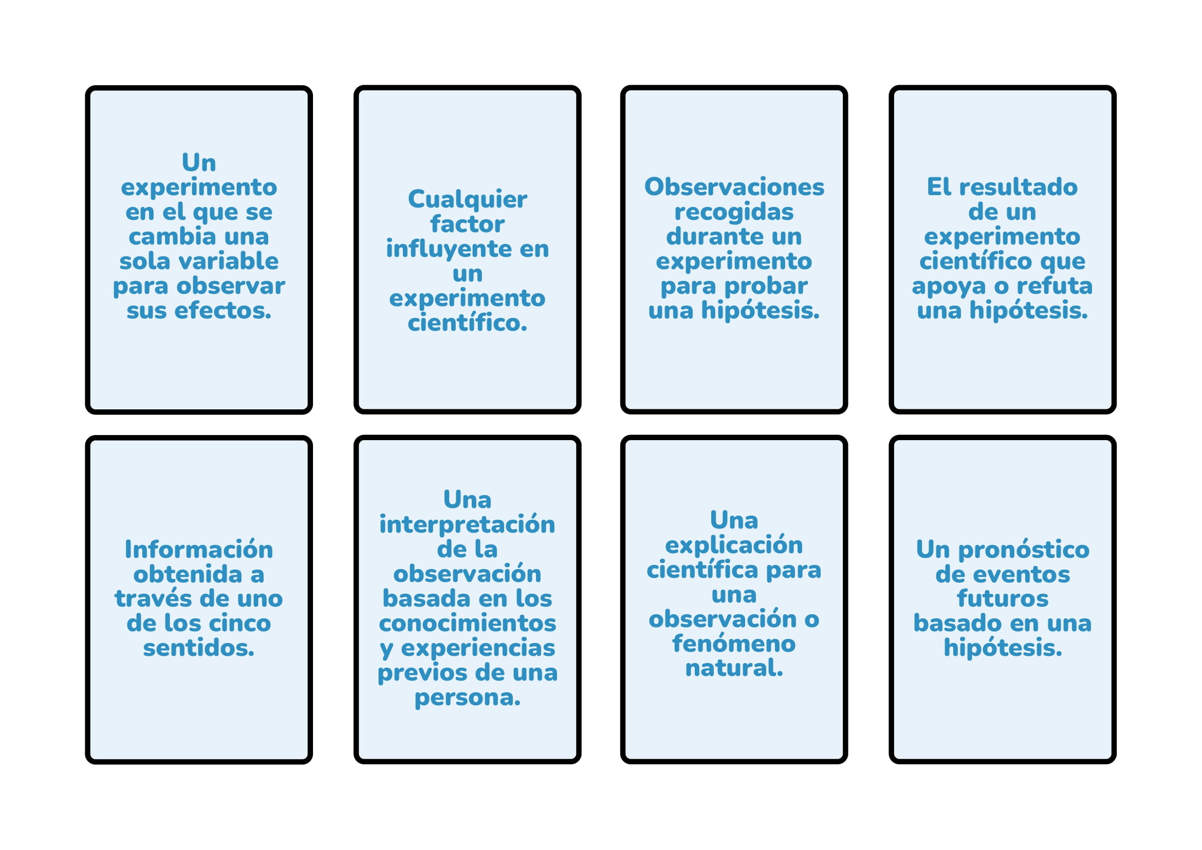 Instrucciones: Imprime las tarjetas a doble cara, asegurándote de alinear correctamente el frente y el dorso. Recorta cada tarjeta y utilízalas para repasar el método científico: lee el frente y trata de recordar la definición o concepto en el dorso, luego verifica tu respuesta girando la tarjeta.