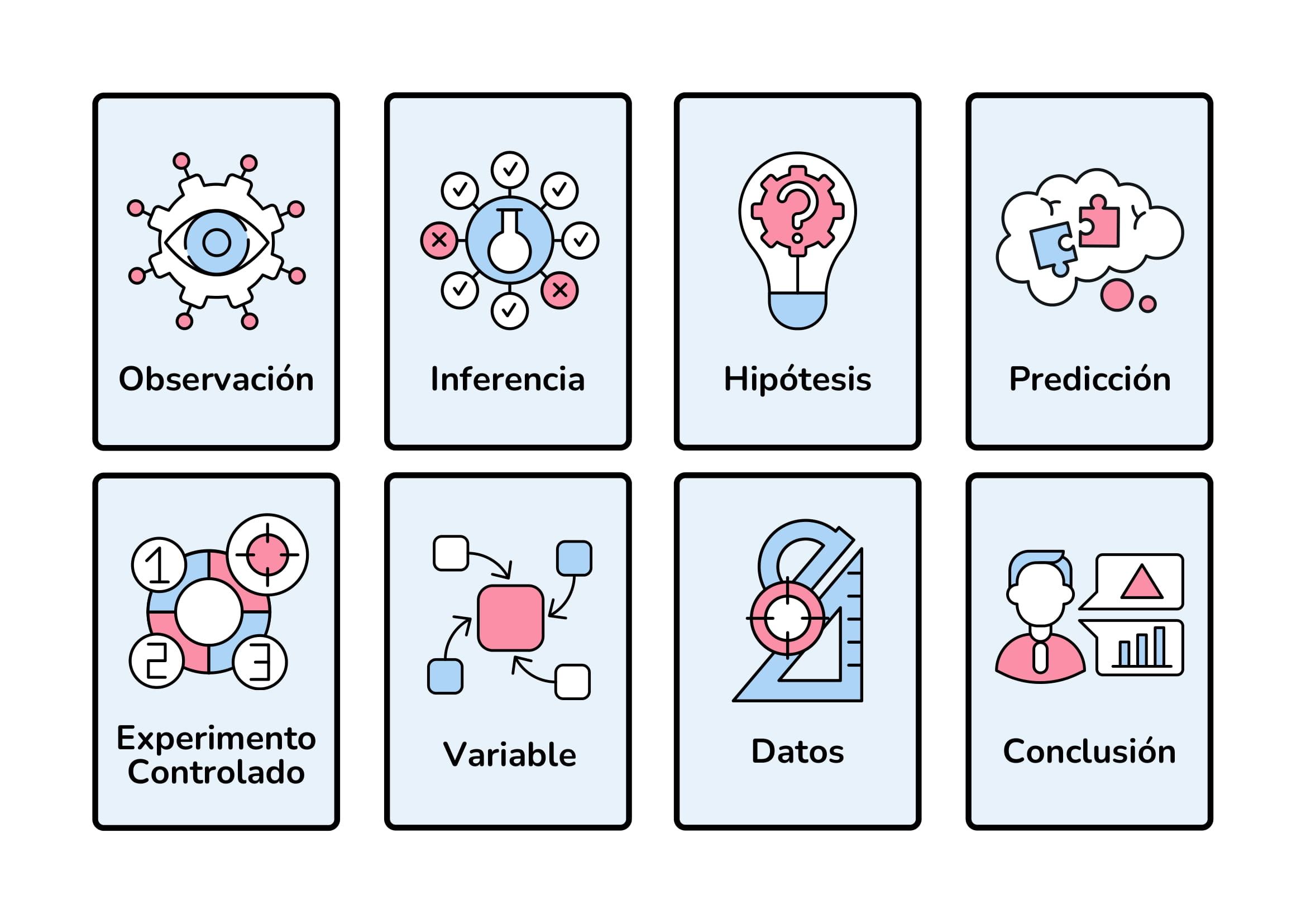 Tarjetas interactivas que explican los pasos del método científico, una forma divertida de enseñar y repasar el proceso científico.