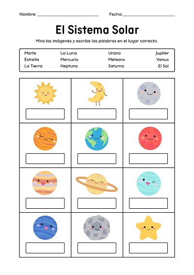 Una actividad interactiva donde los niños pueden identificar y completar los nombres de los planetas del sistema solar, ideal para reforzar el aprendizaje en clases de primaria o como tarea divertida en casa. ¡Perfecta para imprimir y aprender jugando!