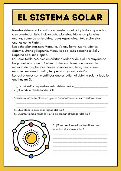 Una actividad educativa que combina un breve texto informativo sobre el sistema solar con cinco preguntas para reflexionar y reforzar el aprendizaje. ¡Perfecta para niños de primaria y para usar en clase o como tarea en casa!